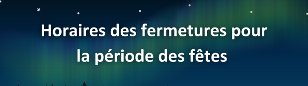 24 décembre : Services d’urgence Du 25 au 28 décembre : Fermé, sur appel Du 29 au 31 décembre : Services d’urgence 1er janvier : Fermé, sur appel 2 janvier : Services d’urgence |